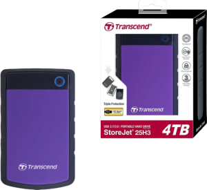 4tb Transcend external hard drive with the USB 3.0 interface, the StoreJet 25H3 provides 4TB of storage and a durable anti-shock silicone outer shell for